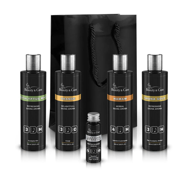 Ervaar de oosterse sferen in je eigen sauna met dit luxe Hamam cadeaupakket. Met vier royale flessen van 250 ml en een potje mentholkristallen geniet je extra lang van verfrissende, kruidige en citrusaroma’s. Deze set combineert klassieke frisheid met warme ontspanning en zorgt zo voor een rijke en veelzijdige saunabeleving in elk seizoen. Gebruik 5 ml saunageur per liter water en vermeng dit in een saunaemmer voor een heerlijke geurervaring.