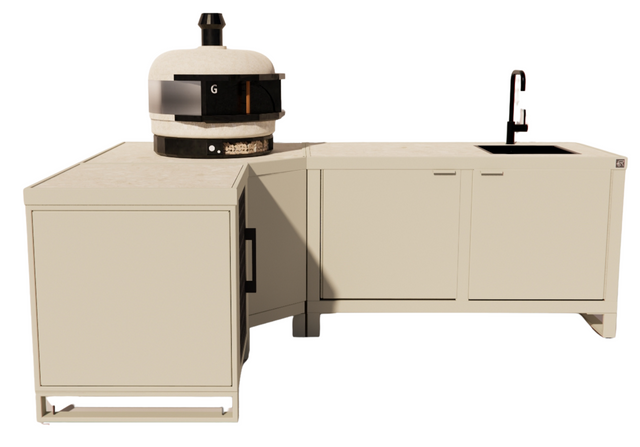 Met deze L-vormige indeling maak je van jouw buitenkeuken een volwaardige werkplek. Het Corner Frame is geschikt voor een grote kamado of pizzaoven, met daaronder ruimte voor houtopslag of een gasfles. Het Single Frame bevat een ingebouwde koelkast zodat je dranken en ingrediënten altijd gekoeld bij de hand hebt. Het Duo Frame voegt een luxe spoelunit en extra opbergruimte toe, waardoor alles perfect op elkaar is afgestemd.