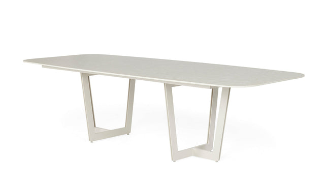 Het aluminium frame is verkrijgbaar in Camel sand, Matt royal grey of Matt white. Voor het blad kies je uit Natural teak of Neolith® varianten in Marble black, Marble white, Terrazzo grey of Terrazzo light taupe. Deze veelzijdigheid zorgt ervoor dat de Palermo dining table moeiteloos aansluit bij elke buitenstijl, van modern strak tot warm natuurlijk.