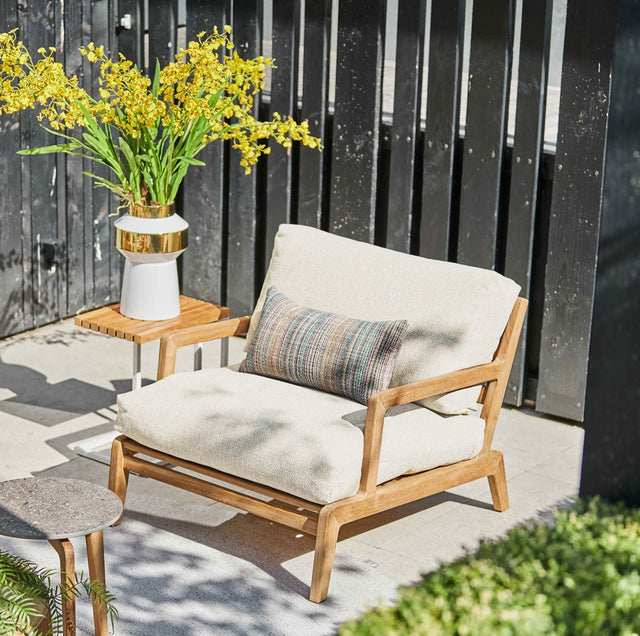 De royale kussens zijn afgewerkt met waterafstotende stof die bestand is tegen onverwachte weersomstandigheden. Zo blijft de stoel altijd netjes ogen en behoudt hij zijn uitnodigende uitstraling, of de zon nu schijnt of er een buitje valt. Dit maakt loungen het hele jaar door zorgeloos.