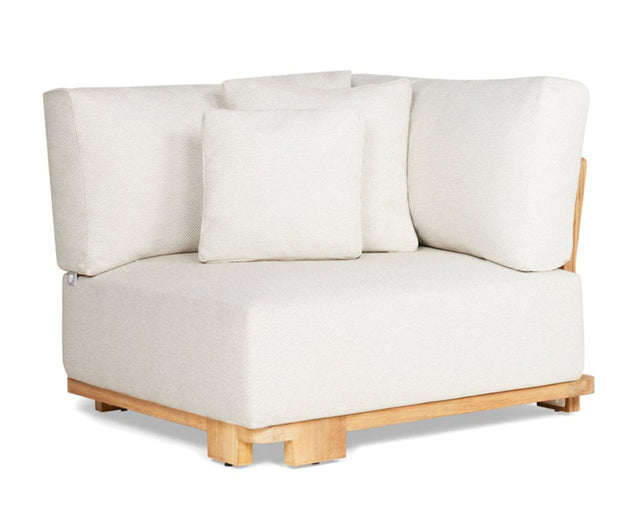 Met het SUNS Vento hoekdeel maak je jouw loungeset helemaal compleet. Dit stijlvolle element combineert een robuust teakhouten frame met luxe Sunproof bekleding in de kleur Light Sand Gravel. Dankzij de duurzame materialen en slimme afwerking creëer je een hoekopstelling die niet alleen comfortabel maar ook bijzonder stijlvol is.