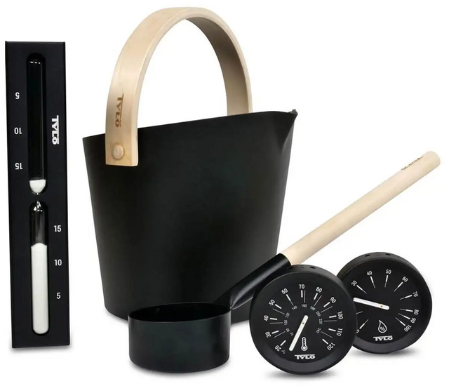 Wil je jouw sauna-ervaring compleet maken met stijlvolle en functionele accessoires? De Tylö Brilliant Black saunaset biedt alles wat je nodig hebt voor een ontspannen en luxueuze saunasessie. Deze set bestaat uit een emmer, scheplepel, hygrometer, thermometer en zandloper, allemaal uitgevoerd in een elegant matzwart design.